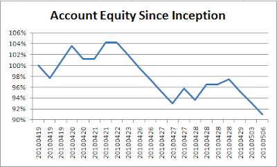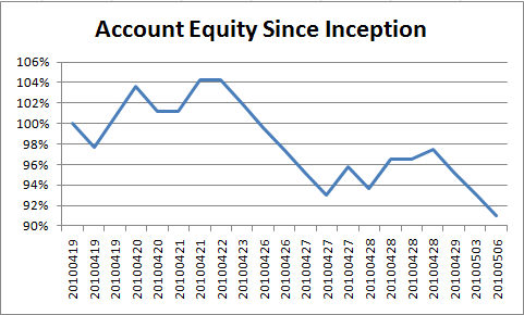 this risk-of-ruin equation, I will spend at least 38% of my time below my current 11.1% drawdown, and I have a 28% chance of losing 1 standard deviation of my average return/month from any point on the equity curve. While the numbers look bad, and a 4 loss streak (current) following a 5 loss streak (last week) is a shitty way to start a career, it seems to be Business As Usual. (Numbers used in calculations: 10% average return/month with a standard deviation of 15%)